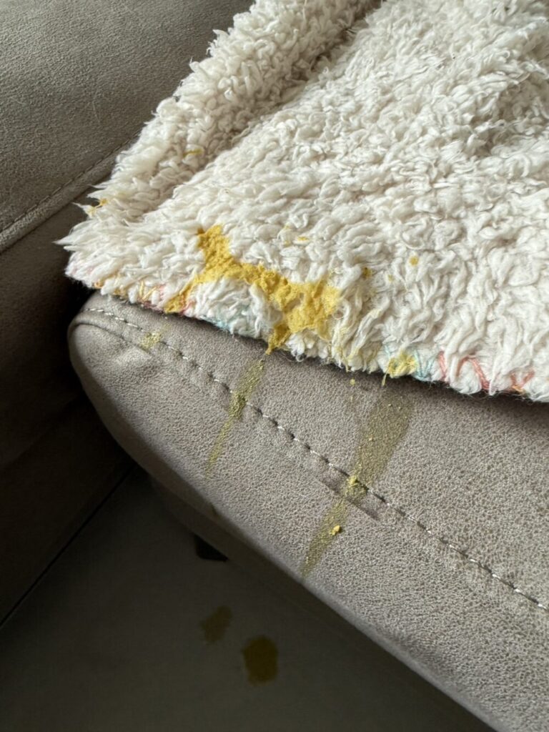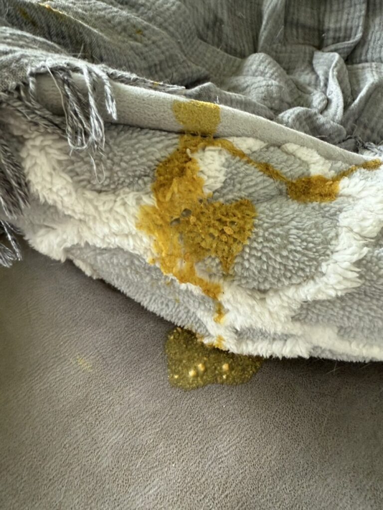 翌朝起きてみると、ジミーが、いつも寝ているベッドで嘔吐をしていました。未消化のフードでした。ベッドで嘔吐したのは初めてです。「やはり体調が悪いのか!」と焦ったのですが、当のジミーはというと、少し食いつきが悪かったものの、ご飯もおやつも食べていたし、毎朝の日課のチュールもしっかり食べていて、様子も特段普段と変わらない感じでした。ただ、少し元気が無いような気はしたので、注意して様子を見る判断をしました。というのも、ジミーはある時から病院で暴れるようになってしまい、過去受診した動物病院の先生から、連れて来る時は鎮静剤を飲ませてきてほしいと言われるほど受診が困難な子なので、あまり病院に連れて行きたく無いという思いもありました。(できるだけ鎮静剤を飲ませたくなかった💦)