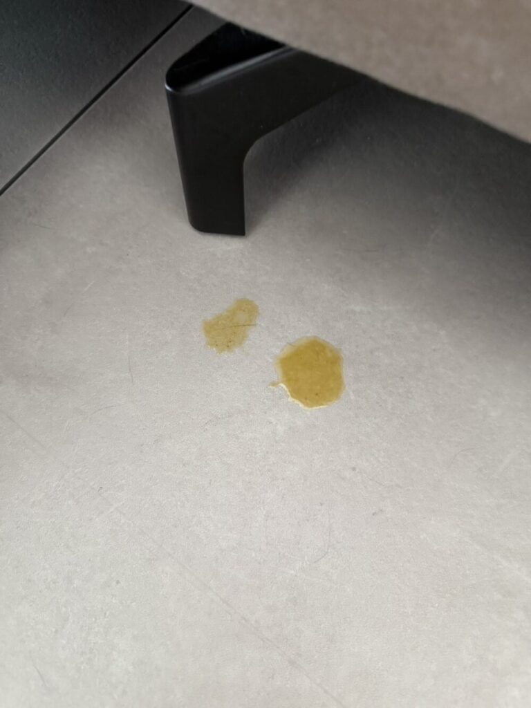 主人から連絡が入っている事に気付いたのは昼前でした。内容は、「ジミーが朝・昼と複数個所に嘔吐していて、ボーっとして元気が無い。」との事。ジミーの吐しゃ物の写真も添付されていたのですが、オレンジがかった濃くて黄色い液体でした。今まで一度にこんなにたくさん嘔吐する事が無く、吐しゃ物も初めてみるような色だったので、これはもしかしたら本当にどこかが悪いのかもしれないと嫌な予感がしたのを覚えています。