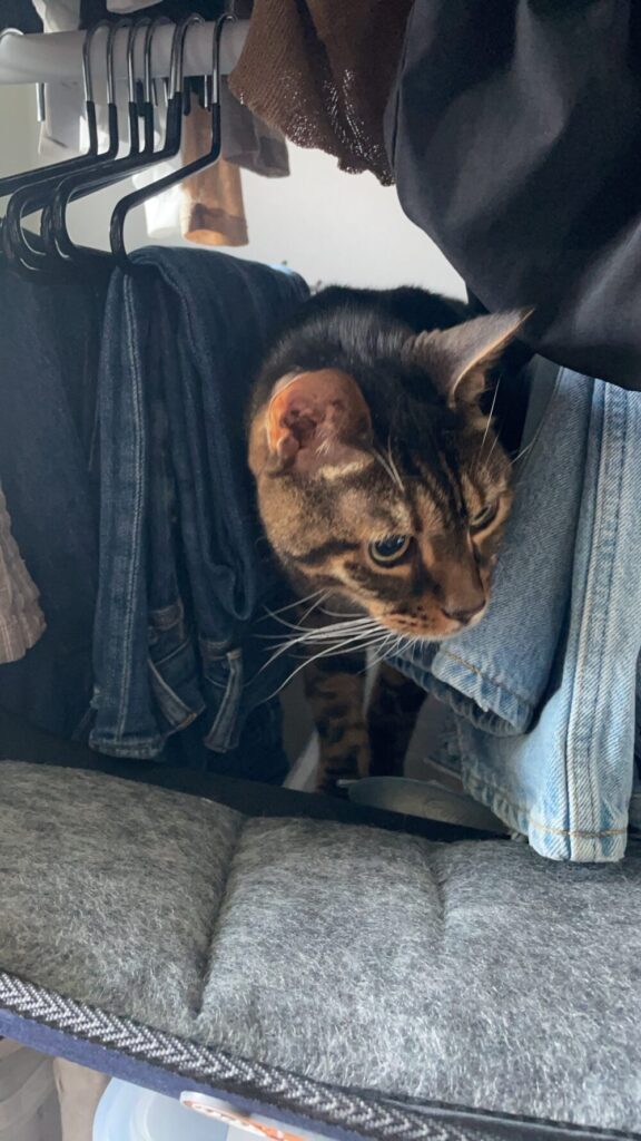 ところがある日、いつも通り大好きなカリカリのおやつをご飯の器に入れてあげても、少ししか食べずに残していたんです。いつもなら、ご飯の上に乗っているおやつだけ、器用に1粒も残さずに全て平らげるのに…。「ん?おかしいな?」と、違和感は感じたのですが、ジミーの様子から元気もあり、特段体調に異変も感じなかったので、「お腹が一杯だったのかな?」くらいにしかその時は考えていませんでした。ですが、この日は普段あまり行かない場所(我が家でいうと、クローゼットにしているお部屋の私の洋服が吊ってある下の暗くて狭い場所)をうろうろする等、普段とは少しだけ違う行動がありました。