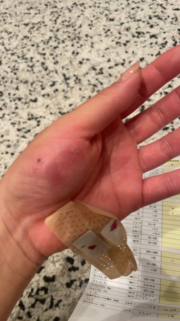 順番が来て診察室に入り、昨日からの様子を伝えました。先生はジミーを見ながら「糖尿かもしれないね」と。取り急ぎ血液検査をする事に。ですが、案の定暴れ倒して看護師さんでも保定が出来ない!ジミーは大きな声に反応しやすく、家の中でも私が電話で話していたりすると興奮して噛んできたりするのですが、先生の声がいかんせん大きいので(ごめんなさい笑)余計興奮してしまい、今までに無いほど暴れてしまいました(因みに、先生はとっても良い先生ですよ)こちらの病院は飼い主も一緒に保定するスタイルなので、主人と私も保定に参加して何とか採血はクリアできました。が、私はしっかり噛まれました(笑)(めちゃくちゃ腫れたので翌日病院で抗生剤をもらいましたよ)